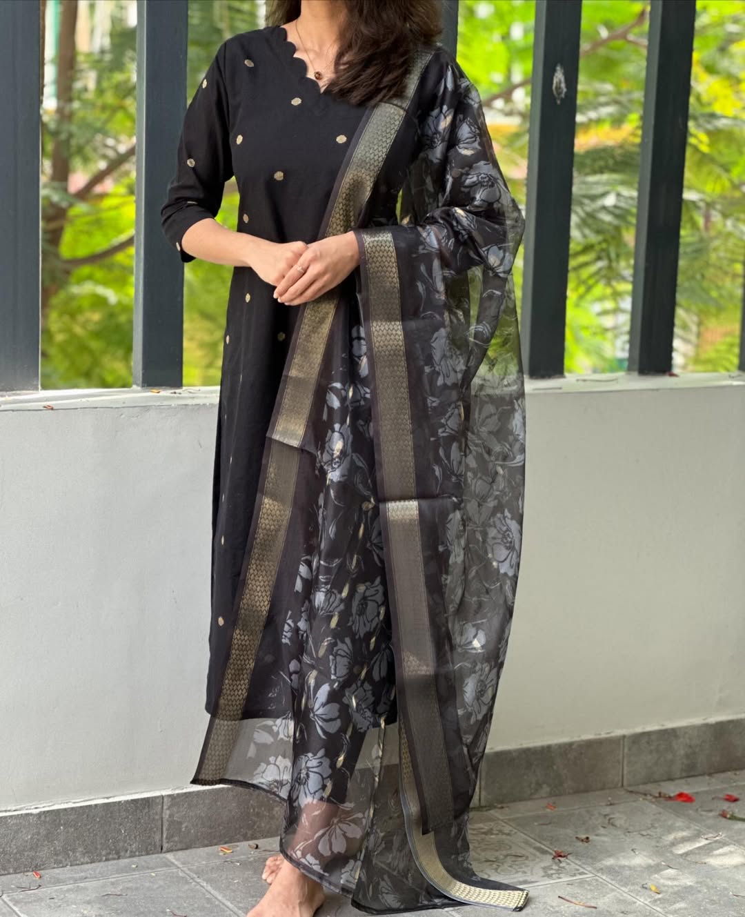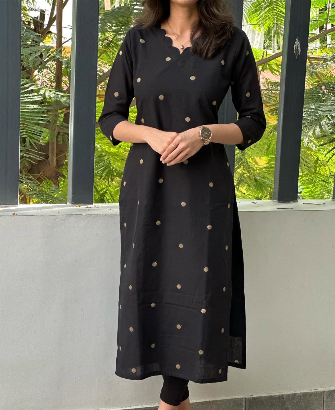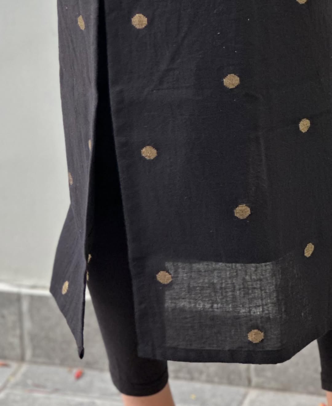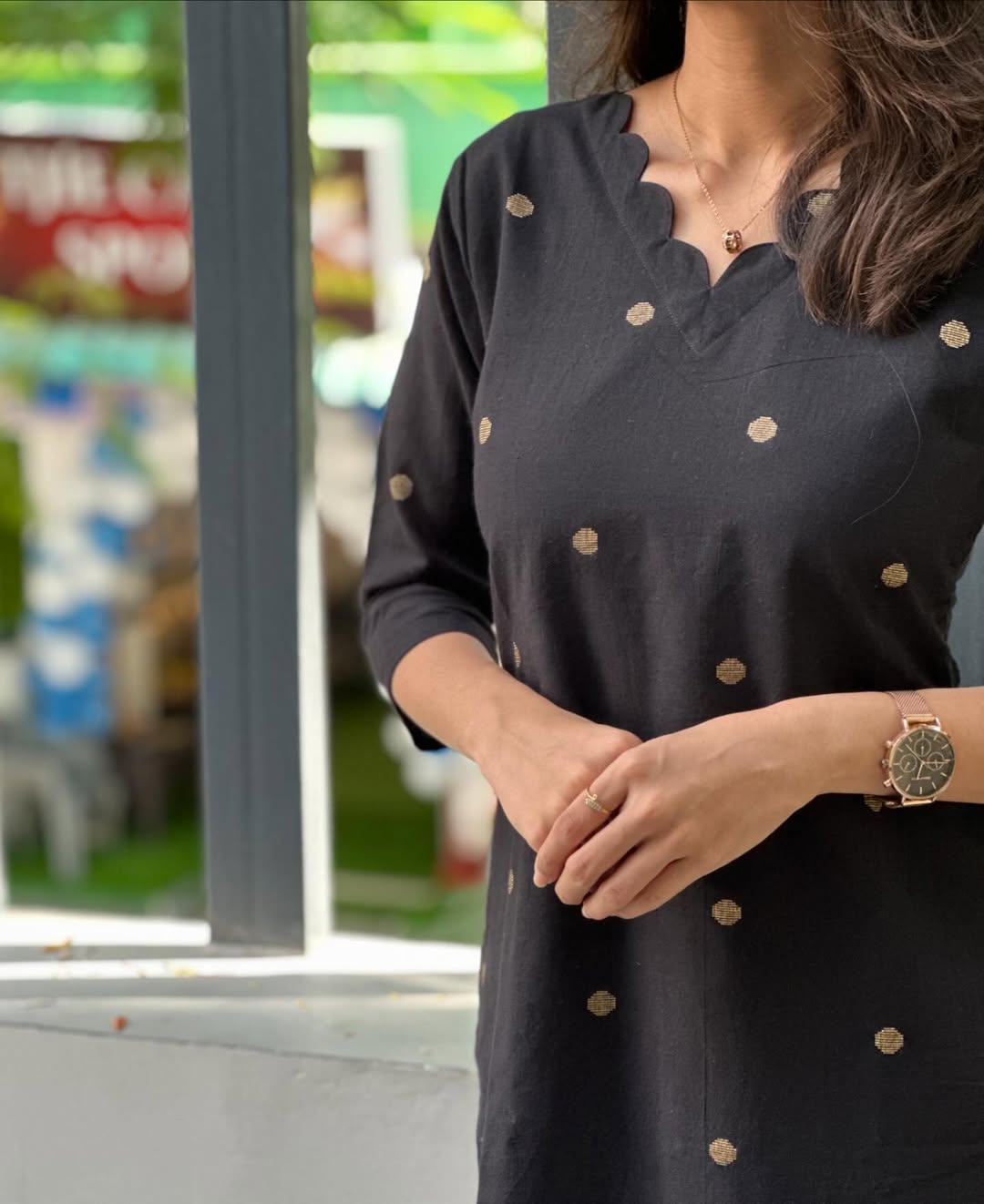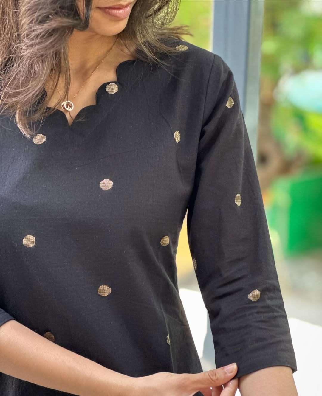 Expertly crafted, comfortable and chic, this Black Kurti With Gold Dollar Butta boasts a unique dupatta design that may slightly vary. Available in sizes XS to XXXL, this kurti offers a perfect fit and can be easily maintained with handwashing and steam ironing for a flawless look. Please note, the color may vary slightly due to lighting. Modal size is XS.