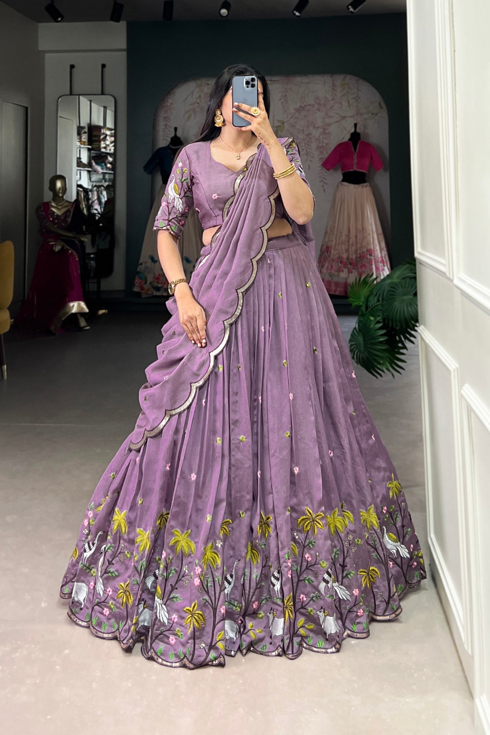 Upgrade your bridesmaid style with our Lavendor Bridesmaid Glow from the Wedding Collection 2025. Made with Vichitra Simmer fabric, sequins, and thread embroidery work, this lehenga and blouse set exudes elegance and class. The lehenga comes with a canvas and can can stitching for a perfect fit, while the blouse and dupatta feature both sides tassels for a unique touch. Package includes drawstring with zip for easy closure. Dress to impress with this 3.5 meter flared lehenga.